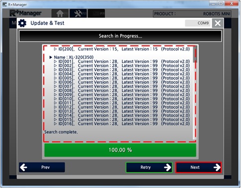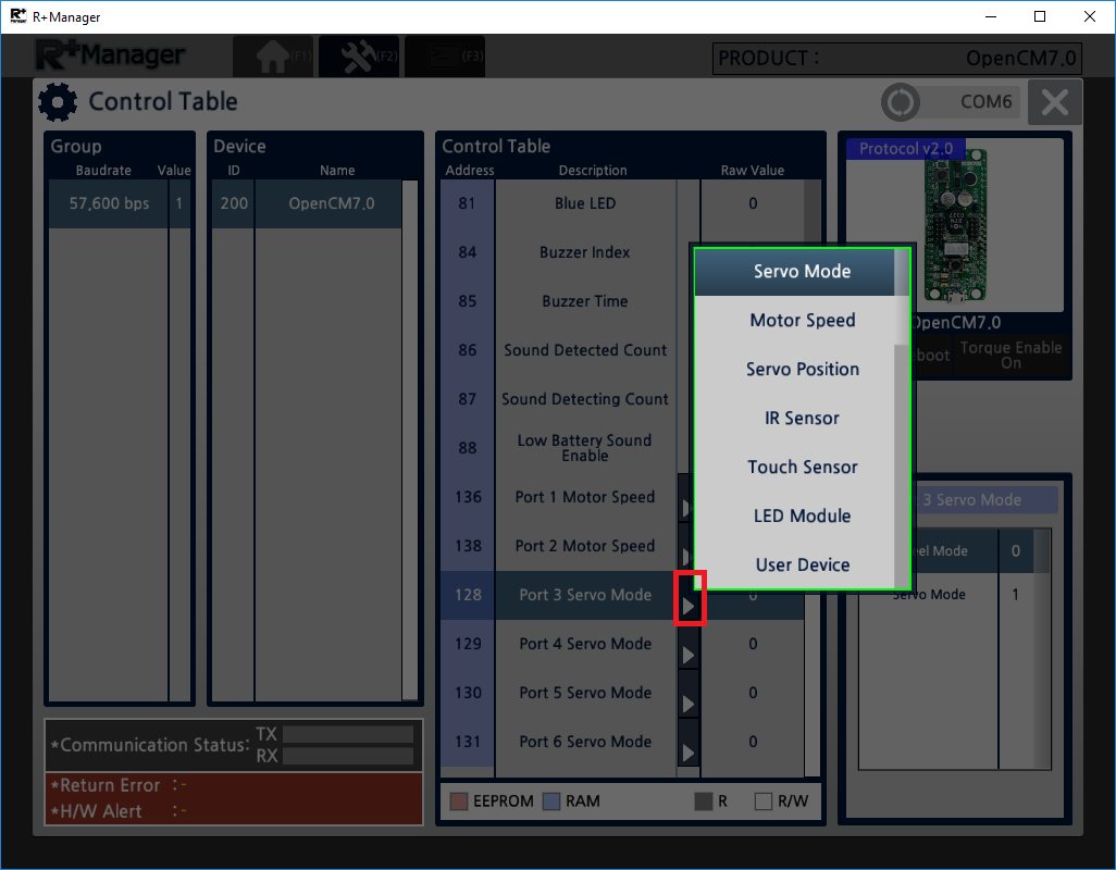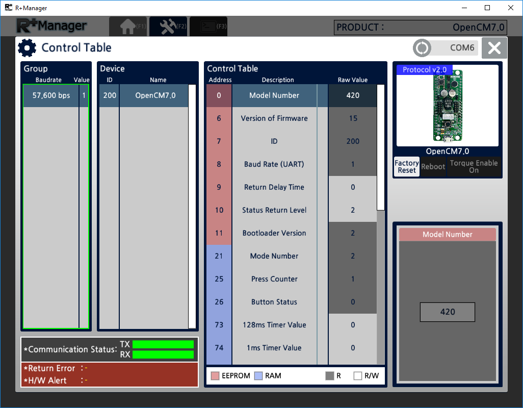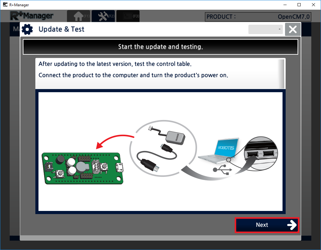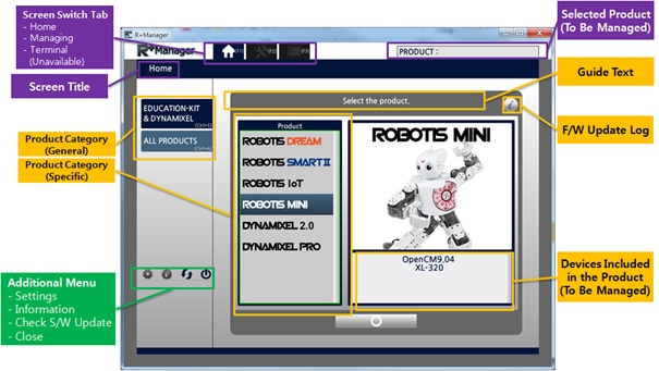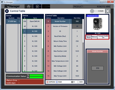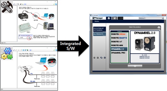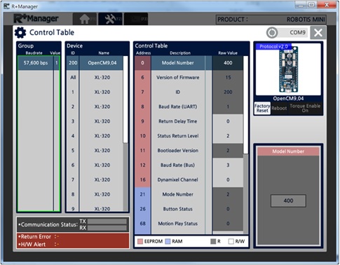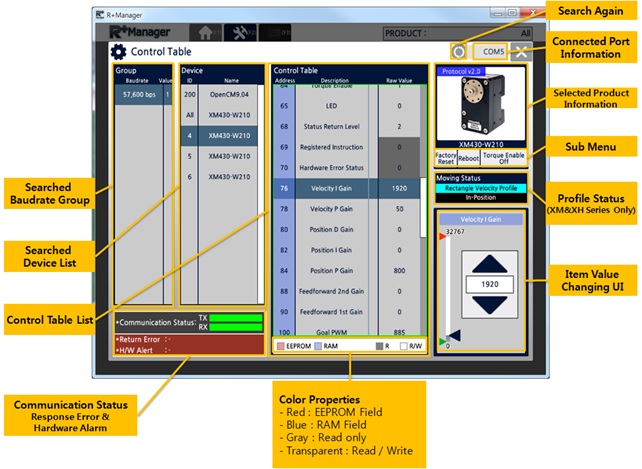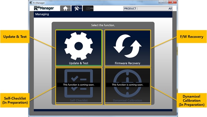 The RoboPlus Manager 2.0 manages the Controller and DYNAMIXEL devices that comprise the robot. By connecting the product, the user can update the product to the latest version and test the Control Table. The functions that were previously provided in RoboPlus Manager 1.0 and Wizard 1.0 have been combined in RoboPlus Manager 2.0.