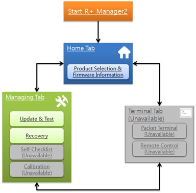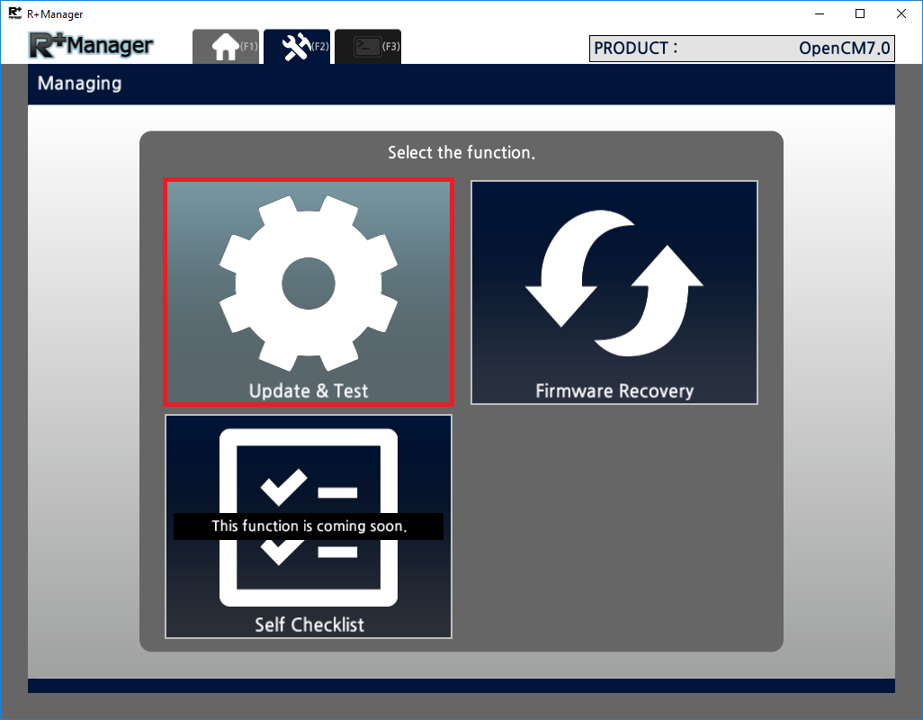 This tab provides Firmware Update / Test / Recovery functions for the previously selected product. Depending on the selected product, the functions that can be used are filtered and showed.