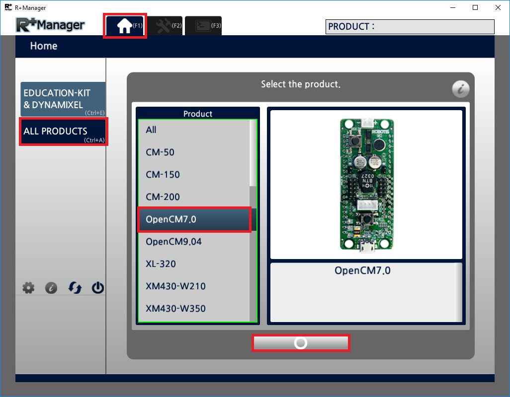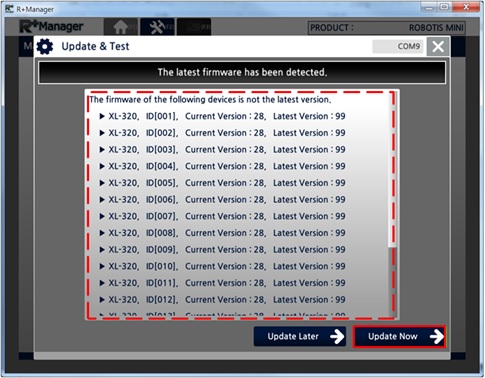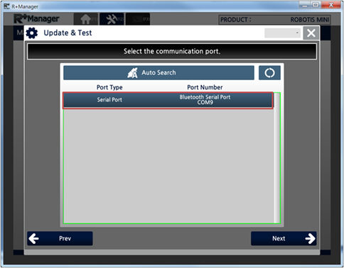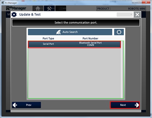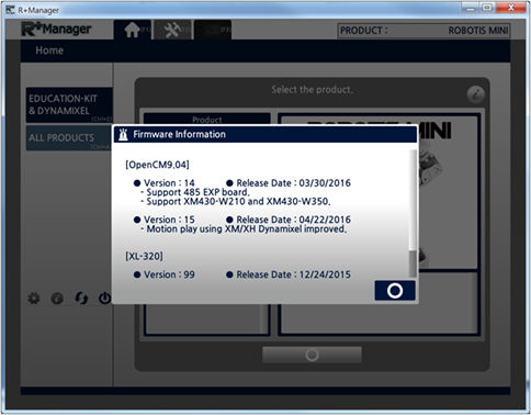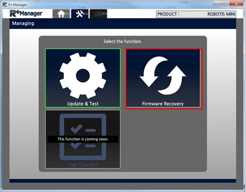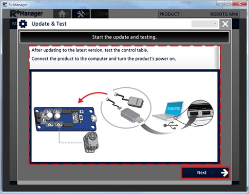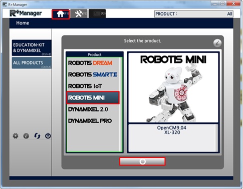 In the Home Tab,select the product that you wish to update or test. (ROBOTIS MINI was selected in the example below)