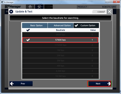 Select the communication speed to search and click the “Next” button. (When using Bluetooth serial port, only 57,600bps can be used)