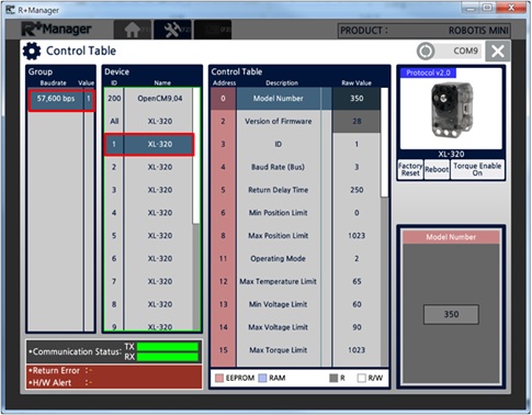 The Control Table window categorizes the control tables according to their communication speed and device model. Select the communication speed and device model that you wish to test. (XL-320 was selected in the example below.)