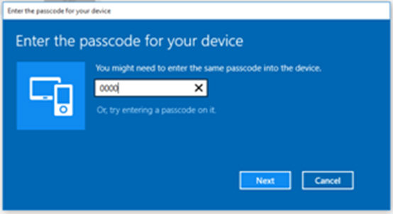 In the device password field, enter 0000 and click on the Next button.