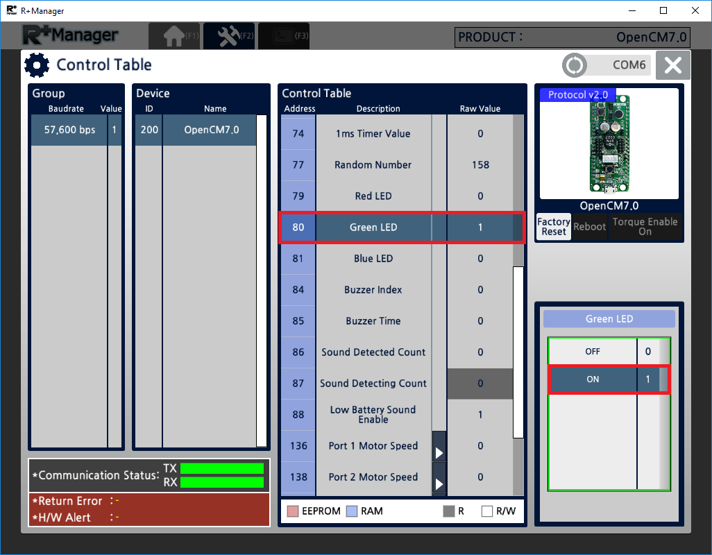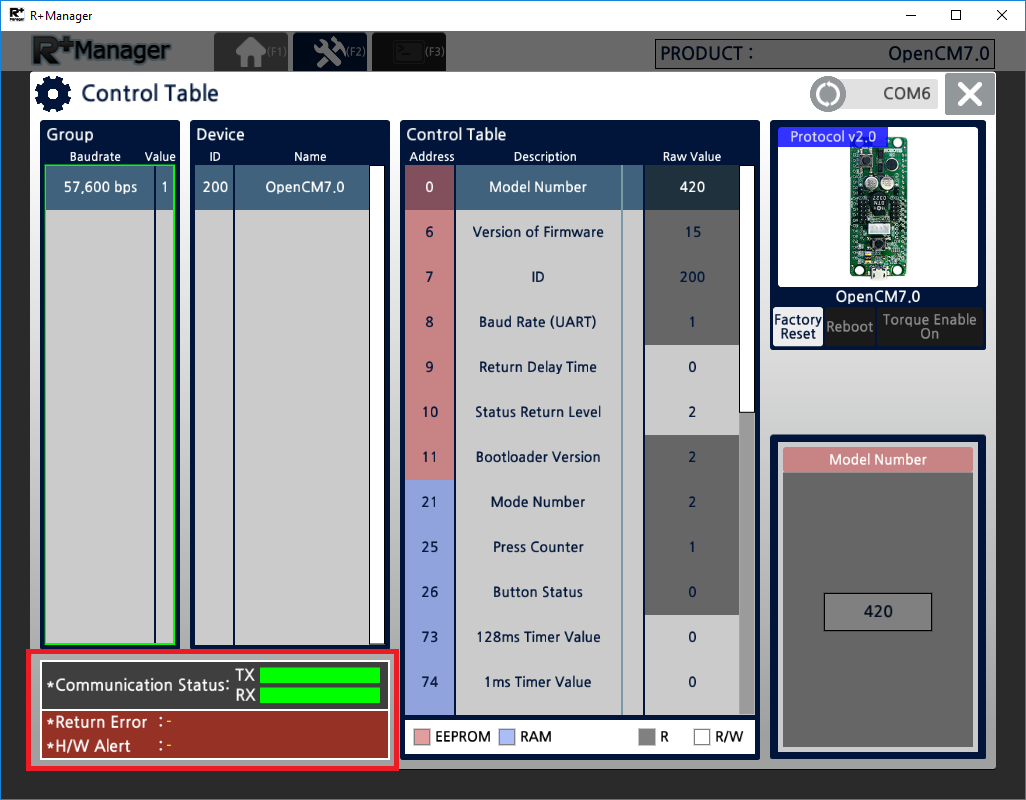 When the connection is established between PC and controller, below screen will be appeared. Control Table window arranges device with Baudrate and Device. If you have connected multiple devices, select baudrate and device of the controller to test.